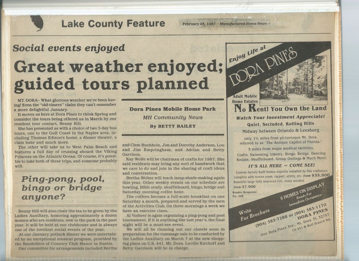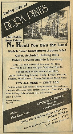 George Cota, a native of Vermont and owner/operator of a summer camp, had decided to seek investment in Florida. He formed a partnership of several people, the largest investors being himself and Bob Mathews“ They selected and purchased a large piece of land in Lake County just east of the Mount Dora city limits. Rezoning of the land from agriculture to mobile home zoning was effective in June 1971. Mr. Cota arrived on site August 1, 1971. Land clearing and mowing of the central portion had already been started.